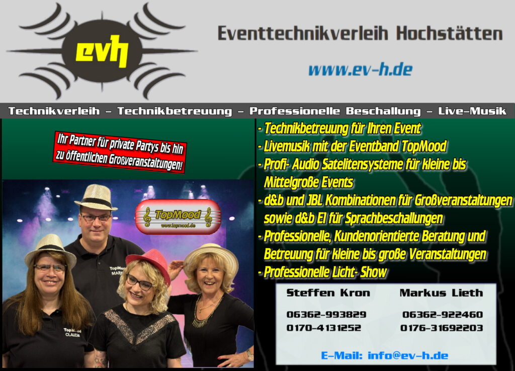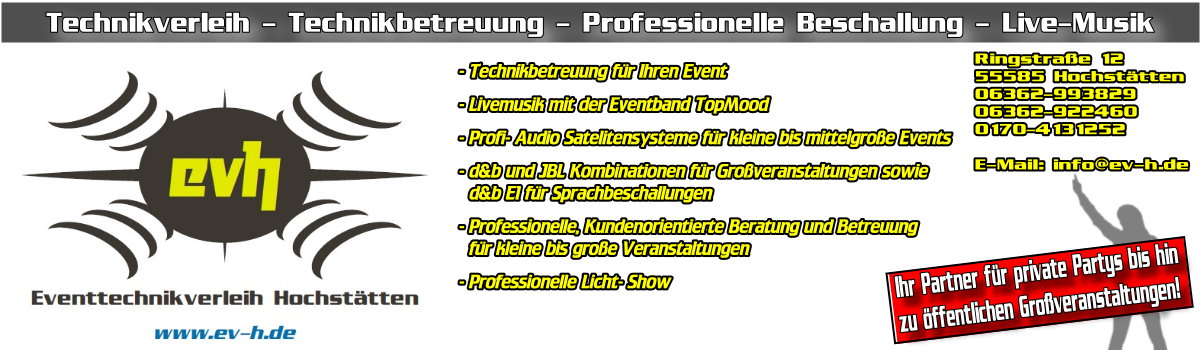 Seit Juni 2012 arbeitet Musik-Lieth mit dem Eventtechnikverleih (EV-H) Hochstätten zusammen. Mit vereinter Kraft sind wir seitdem Ihr Partner für private Partys bis hin zu öffentlichen Großveranstaltungen. Wir haben das Richtige für Sie zu erschwinglichen Preisen. Das Ziel von Eventtechnikverleih Hochstätten und Musik-Lieth ist es, Ihnen einen freundlichen, angemessenen, professionellen und erstklassigen Service zu bieten.